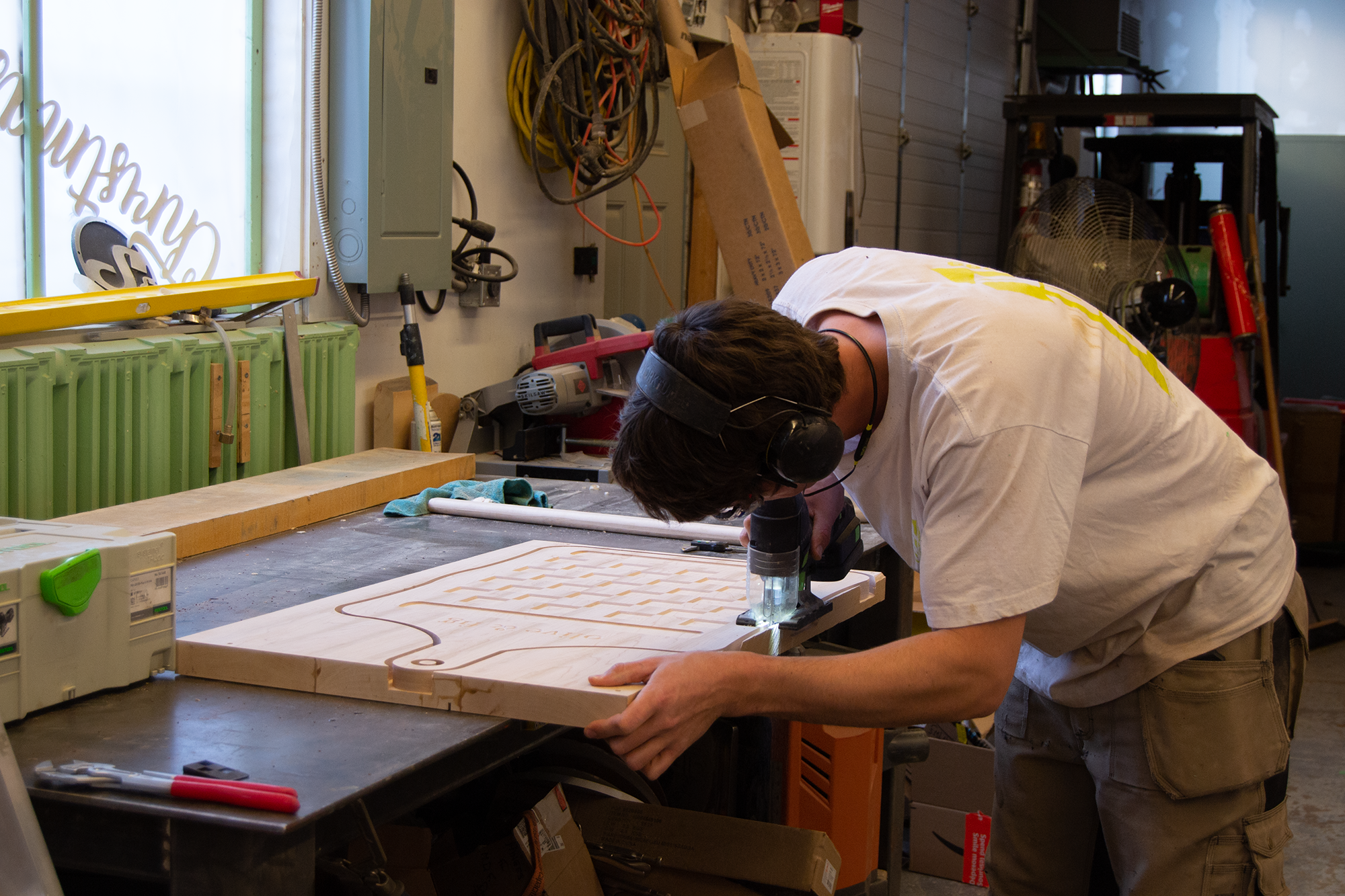 The 35"x26” bespoke board employs common design elements from a typical charcuterie board: a handle, a live edge to ‘frame’ the game space, and a groove to hold ‘game pieces’ – a.k.a. the snacks one can eat.